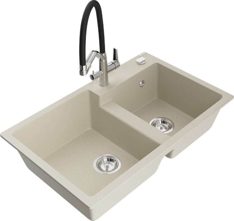 Technické dáta: drez: Rozmer: 800 x 500 x 190 mm Hĺbka komory: 180 mm (väčšia), 180 mm (menšia) Rozmery komory: 440×387 mm (väčšie), 370×303 mm (menšie) Priemer odtoku: ø90 mm Typ: 2-komorový Typ: Zapustené do pracovnej dosky Materiál: žula Farba béžová Povrchová úprava sifónu: Chrome Materiál: žula (80% žulové kamenivo, 20% živice) Prepadový otvor: Áno Otvory: (batérie, automatické) 2 Vysoká odolnosť proti poškriabaniu a zmene farby Odolnosť proti tepelným šokom Ľahko čistiteľný povrch Jeden dodatočný vyfrézovaný otvor na samodierovanie ø35 kuchynská batéria: Materiál: mosadz Farba: chróm/čierna Hlavy: Keramické Prevzdušňovač: Áno Typ hubica: Flexibilný s mosadzným držiakom Rozsah výtoku: 260 mm Výška: 405 mm Typ: Dve rukoväte Dvojhlavá batéria s prídavným filtrom na pitnú vodu(GT) Ean: 5905315054760