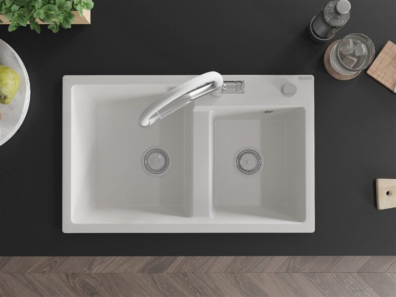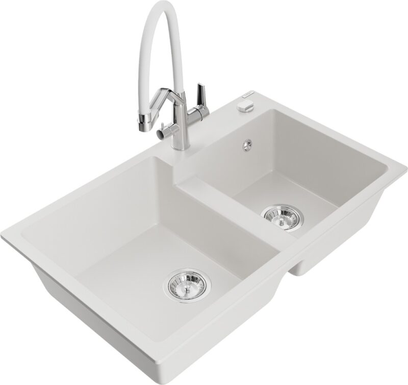 Technické dáta: drez: Rozmer: 800 x 500 x 190 mm Hĺbka komory: 180 mm (väčšia), 180 mm (menšia) Rozmery komory: 440×387 mm (väčšie), 370×303 mm (menšie) Priemer odtoku: ø90 mm Typ: 2-komorový Typ: Zapustené do pracovnej dosky Materiál: žula biela farba Povrchová úprava sifónu: Chrome Materiál: žula (80% žulové kamenivo, 20% živice) Prepadový otvor: Áno Otvory: (batérie, automatické) 2 Vysoká odolnosť proti poškriabaniu a zmene farby Odolnosť proti tepelným šokom Ľahko čistiteľný povrch Jeden dodatočný vyfrézovaný otvor na samodierovanie ø35 kuchynská batéria: Materiál: mosadz Farba: chróm/biela Hlavy: Keramické Prevzdušňovač: Áno Typ hubica: Flexibilný s mosadzným držiakom Rozsah výtoku: 260 mm Výška: 405 mm Typ: Dve rukoväte Dvojhlavá batéria s prídavným filtrom na pitnú vodu(GT) Ean: 5905315054692