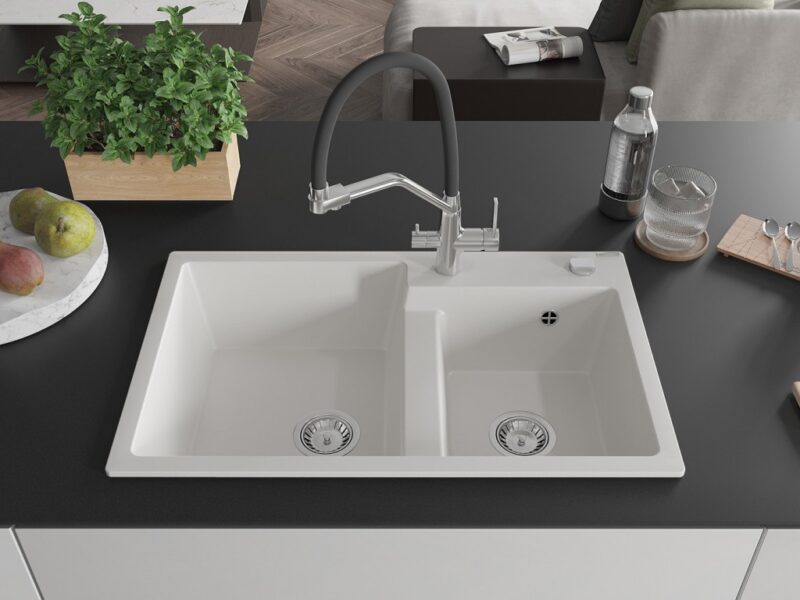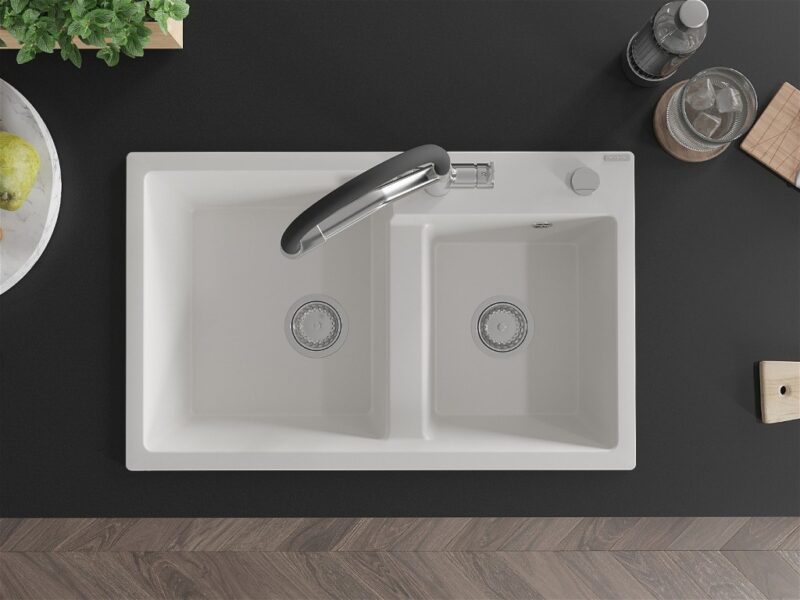 Technické dáta: drez: Rozmer: 800 x 500 x 190 mm Hĺbka komory: 180 mm (väčšia), 180 mm (menšia) Rozmery komory: 440×387 mm (väčšie), 370×303 mm (menšie) Priemer odtoku: ø90 mm Typ: 2-komorový Typ: Zapustené do pracovnej dosky Materiál: žula biela farba Povrchová úprava sifónu: Chrome Materiál: žula (80% žulové kamenivo, 20% živice) Prepadový otvor: Áno Otvory: (batérie, automatické) 2 Vysoká odolnosť proti poškriabaniu a zmene farby Odolnosť proti tepelným šokom Ľahko čistiteľný povrch Jeden dodatočný vyfrézovaný otvor na samodierovanie ø35 kuchynská batéria: Materiál: mosadz Farba: chróm/čierna Hlavy: Keramické Prevzdušňovač: Áno Typ hubica: Flexibilný s mosadzným držiakom Rozsah výtoku: 260 mm Výška: 405 mm Typ: Dve rukoväte Dvojhlavá batéria s prídavným filtrom na pitnú vodu(GT) Ean: 5905315054708