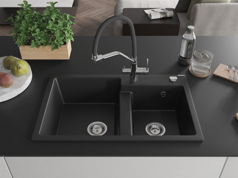 Technické dáta: drez: Rozmer: 800 x 500 x 190 mm Hĺbka komory: 180 mm (väčšia), 180 mm (menšia) Rozmery komory: 440×387 mm (väčšie), 370×303 mm (menšie) Priemer odtoku: ø90 mm Typ: 2-komorový Typ: Zapustené do pracovnej dosky Materiál: žula Čierna farba Povrchová úprava sifónu: Chrome Materiál: žula (80% žulové kamenivo, 20% živice) Prepadový otvor: Áno Otvory: (batérie, automatické) 2 Vysoká odolnosť proti poškriabaniu a zmene farby Odolnosť proti tepelným šokom Ľahko čistiteľný povrch Jeden dodatočný vyfrézovaný otvor na samodierovanie ø35 kuchynská batéria: Materiál: mosadz Farba: chróm/čierna Hlavy: Keramické Prevzdušňovač: Áno Typ hubica: Flexibilný s mosadzným držiakom Rozsah výtoku: 260 mm Výška: 405 mm Typ: Dve rukoväte Dvojhlavá batéria s prídavným filtrom na pitnú vodu(GT) Ean: 5905315055064