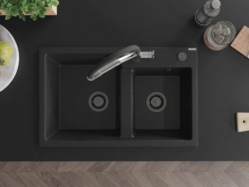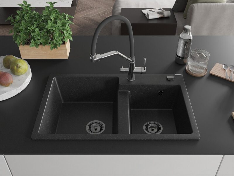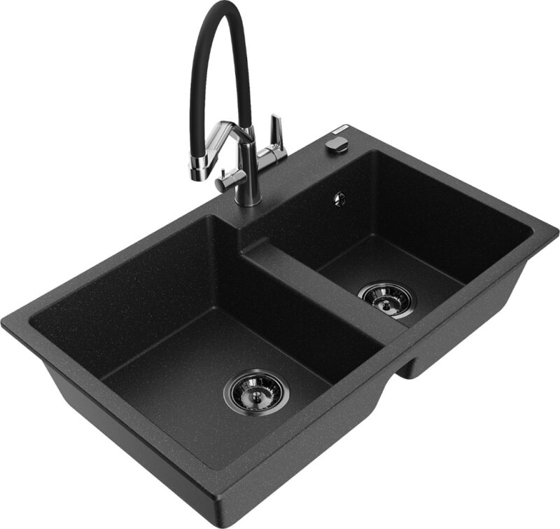 Technické dáta: Drez: Rozmer: 800x500x190 mm Hĺbka komory: 180 mm (väčšia), 180 mm (menšia) Rozmery komory: 440×387 mm (väčšie), 370×303 mm (menšie) Priemer odtoku: ø90 mm Typ: 2-komorový Typ: Zapustené do pracovnej dosky Materiál: žula Farba: čierna/strieborná metalíza Povrchová úprava sifónu: čierna Materiál: žula (80% žulové kamenivo 20% živice) Prepadový otvor: Áno Otvory: (batérie, automat) 2 Vysoká odolnosť proti poškriabaniu a zmene farby Odolnosť proti tepelným šokom Povrch pre ľahké čistenie Jeden dodatočný vyfrézovaný otvor na samodierovanie ø35 Kuchynská batéria: Materiál: mosadz Farba: chróm/čierna Hlavy: Keramické Perlátor: Áno Typ výtoku: Flexibilný s mosadznou podperou Rozsah výtoku: 260 mm Výška: 405 mm Typ: Dve rukoväte Dvojhlavá batéria s prídavným filtrom na pitnú vodu(GT) Ean: 5905315054890