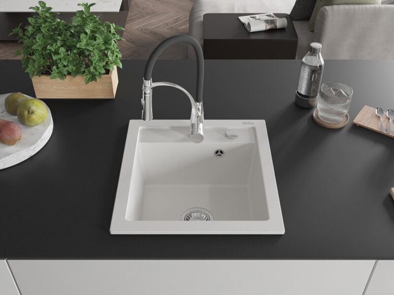 Technické dáta: drez: Rozmer: 520 x 490 x 210 mm Hĺbka komory: 200 mm Rozmery komory: 410×360 mm Priemer odtoku: ø90 mm Typ: 1-komorový Typ: Zapustené do pracovnej dosky biela farba Povrchová úprava sifónu: Chrome Materiál: žula (80% žulové kamenivo, 20% živice) Prepadový otvor: Áno Otvory: (batérie, automatické) 2 Vysoká odolnosť proti poškriabaniu a zmene farby Odolnosť proti tepelným šokom Ľahko čistiteľný povrch Jeden dodatočný vyfrézovaný otvor na samodierovanie ø35 kuchynská batéria: Materiál: mosadz Farba: chróm/čierna Hlava: Keramická Prevzdušňovač: Áno Typ: Jedna páka Výška batérie: 430 mm Rozsah výtoku: 185 mm Batéria má výsuvný výtok(GT) Ean: 5905315043368
