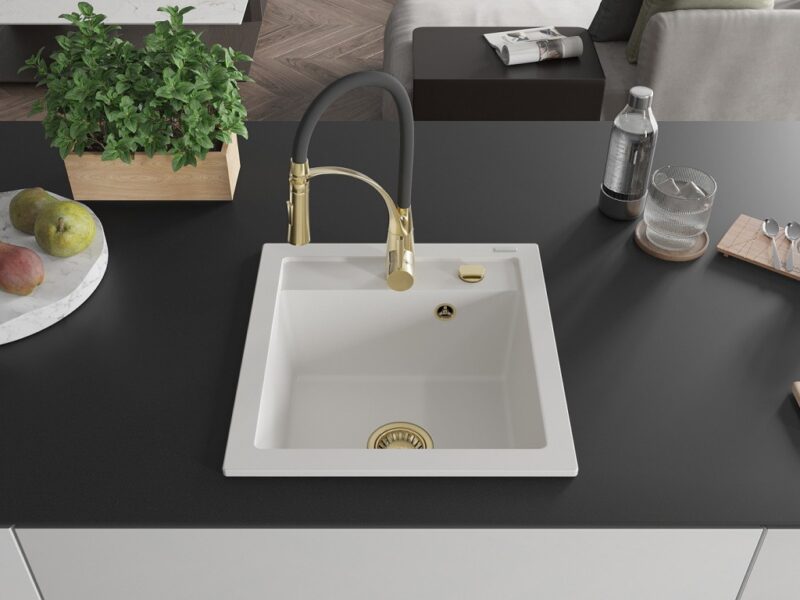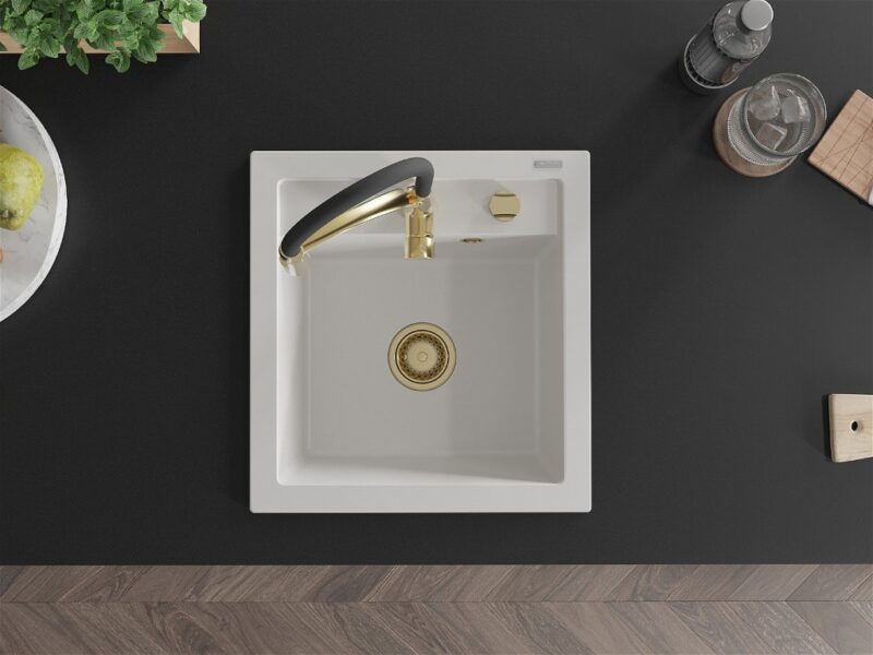 Technické dáta: drez: Rozmer: 520 x 490 x 210 mm Hĺbka komory: 200 mm Rozmery komory: 410×360 mm Priemer odtoku: ø90 mm Typ: 1-komorový Typ: Zapustené do pracovnej dosky biela farba Povrchová úprava sifónu: zlatá Materiál: žula (80% žulové kamenivo, 20% živice) Prepadový otvor: Áno Otvory: (batérie, automatické) 2 Vysoká odolnosť proti poškriabaniu a zmene farby Odolnosť proti tepelným šokom Ľahko čistiteľný povrch Jeden dodatočný vyfrézovaný otvor na samodierovanie ø35 kuchynská batéria: Materiál: mosadz Farba: Zlatá/Čierna Hlava: Keramická Prevzdušňovač: Áno Typ: Jedna páka Výška batérie: 430 mm Rozsah výtoku: 185 mm Batéria má výsuvný výtok(GT) Ean: 5905315043382