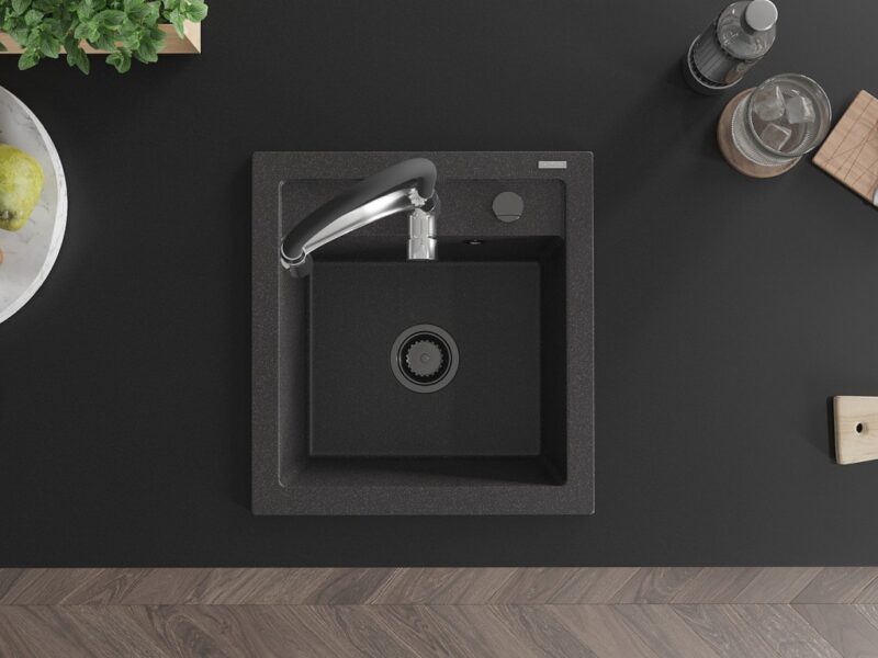 Technické dáta: drez: Rozmer: 520 x 490 x 210 mm Hĺbka komory: 200 mm Rozmery komory: 410×360 mm Priemer odtoku: ø90 mm Typ: 1-komorový Typ: Zapustené do pracovnej dosky Farba: Škvrnitá čierna Povrchová úprava sifónu: čierna Materiál: žula (80% žulové kamenivo, 20% živice) Prepadový otvor: Áno Otvory: (batérie, automatické) 2 Vysoká odolnosť proti poškriabaniu a zmene farby Odolnosť proti tepelným šokom Ľahko čistiteľný povrch Jeden dodatočný vyfrézovaný otvor na samodierovanie ø35 kuchynská batéria: Materiál: mosadz Farba: chróm/čierna Hlava: Keramická Prevzdušňovač: Áno Typ: Jedna páka Výška batérie: 430 mm Rozsah výtoku: 185 mm Batéria má výsuvný výtok(GT) Ean: 5905315043672