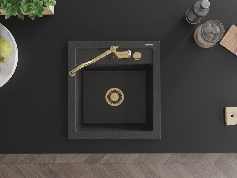 Technické dáta: drez: Rozmer: 520 x 490 x 210 mm Hĺbka komory: 200 mm Rozmery komory: 410×360 mm Priemer odtoku: ø90 mm Typ: 1-komorový Typ: Zapustené do pracovnej dosky Farba: Škvrnitá čierna Povrchová úprava sifónu: zlatá Materiál: žula (80% žulové kamenivo, 20% živice) Prepadový otvor: Áno Otvory: (batérie, automatické) 2 Vysoká odolnosť proti poškriabaniu a zmene farby Odolnosť proti tepelným šokom Ľahko čistiteľný povrch Jeden dodatočný vyfrézovaný otvor na samodierovanie ø35 kuchynská batéria: Materiál: mosadz Farba: Zlatá Hlava: Keramická Prevzdušňovač: Áno Typ: Jedna páka Výška batérie: 290 mm Rozsah výtoku: 260 mm(GT) Ean: 5905315038258