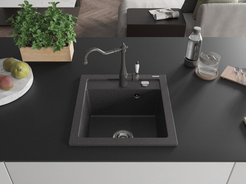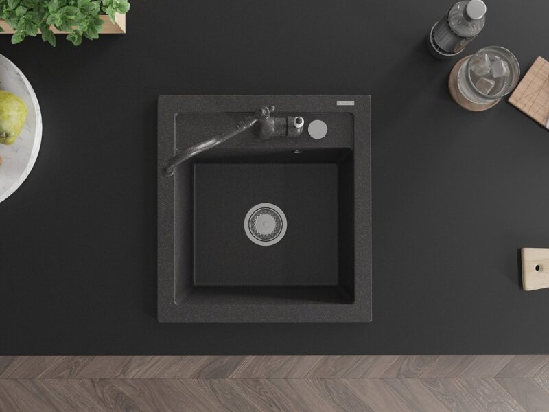 Technické dáta: drez: Rozmer: 520 x 490 x 210 mm Hĺbka komory: 200 mm Rozmery komory: 410×360 mm Priemer odtoku: ø90 mm Typ: 1-komorový Typ: Zapustené do pracovnej dosky Farba: Škvrnitá čierna Povrchová úprava sifónu: Chrome Materiál: žula (80% žulové kamenivo, 20% živice) Prepadový otvor: Áno Otvory: (batérie, automatické) 2 Vysoká odolnosť proti poškriabaniu a zmene farby Odolnosť proti tepelným šokom Ľahko čistiteľný povrch Jeden dodatočný vyfrézovaný otvor na samodierovanie ø35 kuchynská batéria: Materiál: mosadz Farba: Škvrnitá čierna Hlava: Keramická Prevzdušňovač: Áno Typ: Jedna páka Výška batérie: 290 mm Rozsah výtoku: 260 mm(GT) Ean: 5905315038289