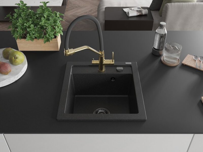 Technické dáta: drez: Rozmer: 520 x 490 x 210 mm Hĺbka komory: 200 mm Rozmery komory: 410×360 mm Priemer odtoku: ø90 mm Typ: 1-komorový Typ: Zapustené do pracovnej dosky Farba: čierna/strieborná metalíza Povrchová úprava sifónu: čierna Materiál: žula (80% žulové kamenivo, 20% živice) Prepadový otvor: Áno Otvory: (batérie, automatické) 2 Vysoká odolnosť proti poškriabaniu a zmene farby Odolnosť proti tepelným šokom Ľahko čistiteľný povrch Jeden dodatočný vyfrézovaný otvor na samodierovanie ø35 kuchynská batéria: Materiál: mosadz Povrchová úprava: zlatá/čierna Hlavy: Keramické Prevzdušňovač: Áno Typ hubica: Flexibilný s mosadzným držiakom Rozsah výtoku: 260 mm Výška: 405 mm Typ: Dve rukoväte Dvojhlavá batéria s prídavným filtrom na pitnú vodu(GT) Ean: 5905315044310