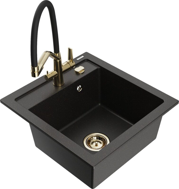 Technické dáta: drez: Rozmer: 520 x 490 x 210 mm Hĺbka komory: 200 mm Rozmery komory: 410×360 mm Priemer odtoku: ø90 mm Typ: 1-komorový Typ: Zapustené do pracovnej dosky Farba: čierna / zlatá metalíza Povrchová úprava sifónu: zlatá Materiál: žula (80% žulové kamenivo, 20% živice) Prepadový otvor: Áno Otvory: (batérie, automatické) 2 Vysoká odolnosť proti poškriabaniu a zmene farby Odolnosť proti tepelným šokom Ľahko čistiteľný povrch Jeden dodatočný vyfrézovaný otvor na samodierovanie ø35 kuchynská batéria: Materiál: mosadz Povrchová úprava: zlatá/čierna Hlavy: Keramické Prevzdušňovač: Áno Typ hubica: Flexibilný s mosadzným držiakom Rozsah výtoku: 260 mm Výška: 405 mm Typ: Dve rukoväte Dvojhlavá batéria s prídavným filtrom na pitnú vodu(GT) Ean: 5905315044556