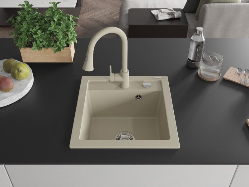 Technické dáta: drez: Rozmer: 520 x 490 x 210 mm Hĺbka komory: 200 mm Rozmery komory: 410×360 mm Priemer odtoku: ø90 mm Typ: 1-komorový Typ: Zapustené do pracovnej dosky Farba béžová Povrchová úprava sifónu: Chrome Materiál: žula (80% žulové kamenivo, 20% živice) Prepadový otvor: Áno Otvory: (batérie, automatické) 2 Vysoká odolnosť proti poškriabaniu a zmene farby Odolnosť proti tepelným šokom Ľahko čistiteľný povrch Jeden dodatočný vyfrézovaný otvor na samodierovanie ø35 kuchynská batéria: Materiál: mosadz Farba béžová Hlava: Keramická Prevzdušňovač: Áno Typ: Jedna páka Výška batérie: 380 mm Rozsah výtoku: 252 mm Typ výtoku: Výsuvný(GT) Ean: 5905315027818