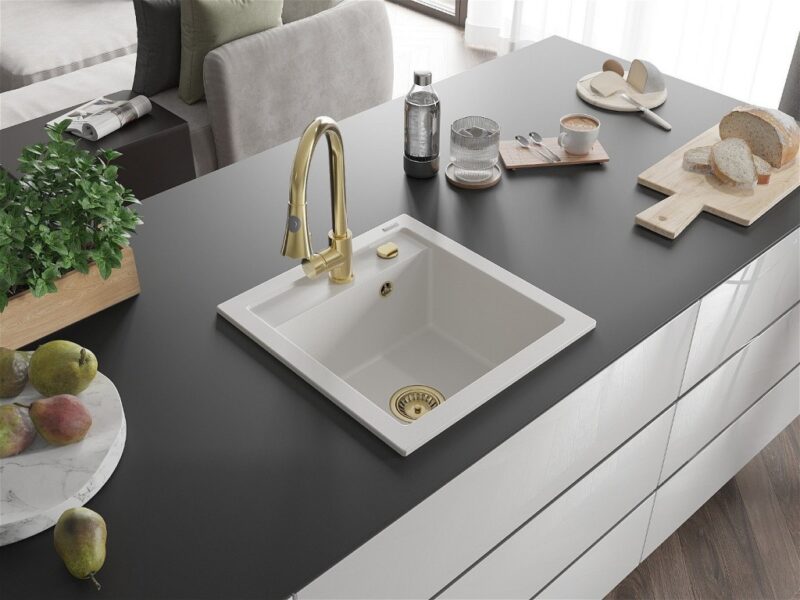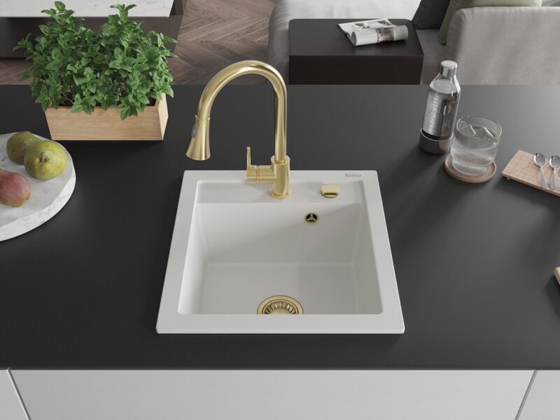 Technické dáta: drez: Rozmer: 520 x 490 x 210 mm Hĺbka komory: 200 mm Rozmery komory: 410×360 mm Priemer odtoku: ø90 mm Typ: 1-komorový Typ: Zapustené do pracovnej dosky biela farba Povrchová úprava sifónu: zlatá Materiál: žula (80% žulové kamenivo, 20% živice) Prepadový otvor: Áno Otvory: (batérie, automatické) 2 Vysoká odolnosť proti poškriabaniu a zmene farby Odolnosť proti tepelným šokom Ľahko čistiteľný povrch Jeden dodatočný vyfrézovaný otvor na samodierovanie ø35 kuchynská batéria: Materiál: mosadz Farba: Zlatá Hlava: Keramická Prevzdušňovač: Áno Typ: Jedna páka Výška batérie: 380 mm Rozsah výtoku: 252 mm Typ výtoku: Výsuvný(GT) Ean: 5905315027788