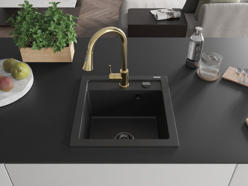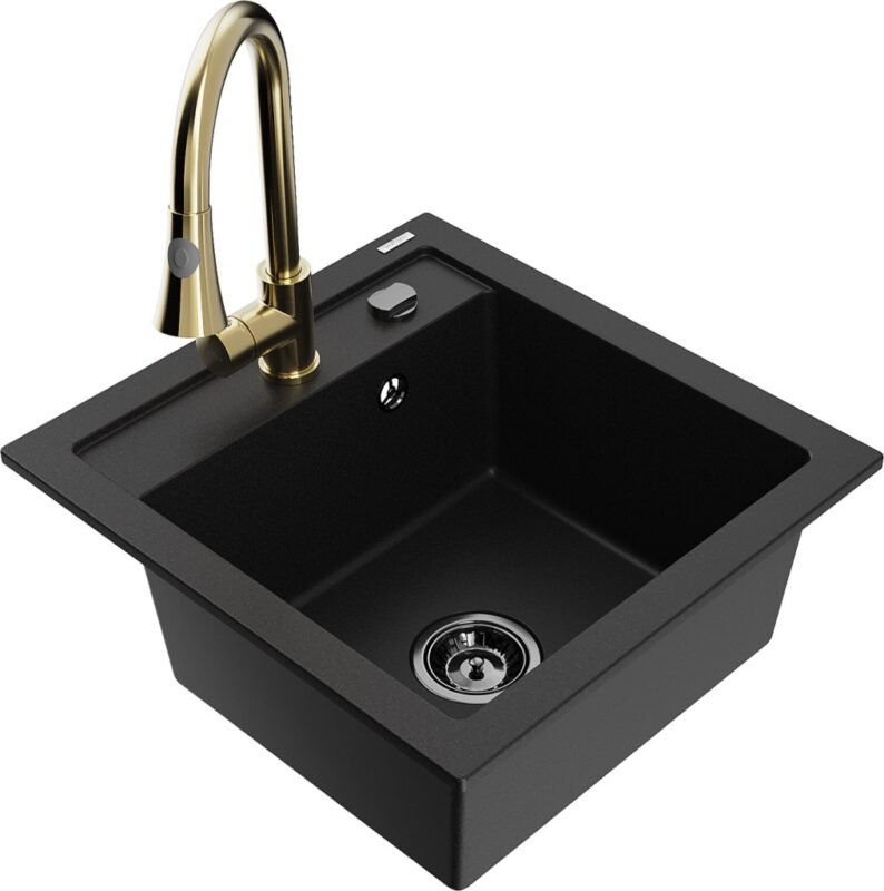 Technické dáta: drez: Rozmer: 520 x 490 x 210 mm Hĺbka komory: 200 mm Rozmery komory: 410×360 mm Priemer odtoku: ø90 mm Typ: 1-komorový Typ: Zapustené do pracovnej dosky Čierna farba Povrchová úprava sifónu: čierna Materiál: žula (80% žulové kamenivo, 20% živice) Prepadový otvor: Áno Otvory: (batérie, automatické) 2 Vysoká odolnosť proti poškriabaniu a zmene farby Odolnosť proti tepelným šokom Ľahko čistiteľný povrch Jeden dodatočný vyfrézovaný otvor na samodierovanie ø35 kuchynská batéria: Materiál: mosadz Farba: Zlatá Hlava: Keramická Prevzdušňovač: Áno Typ: Jedna páka Výška batérie: 380 mm Rozsah výtoku: 252 mm Typ výtoku: Výsuvný(GT) Ean: 5905315028051
