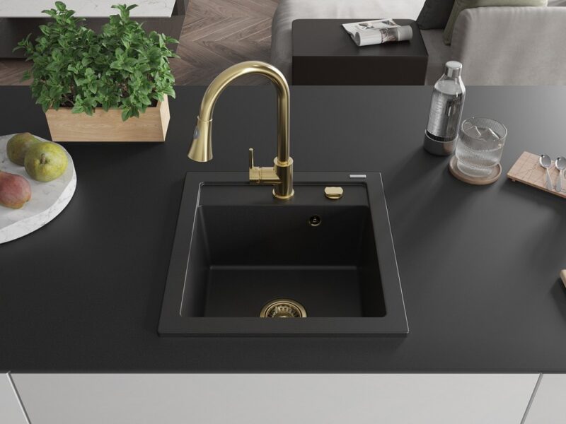 Technické dáta: drez: Rozmer: 520 x 490 x 210 mm Hĺbka komory: 200 mm Rozmery komory: 410×360 mm Priemer odtoku: ø90 mm Typ: 1-komorový Typ: Zapustené do pracovnej dosky Čierna farba Povrchová úprava sifónu: zlatá Materiál: žula (80% žulové kamenivo, 20% živice) Prepadový otvor: Áno Otvory: (batérie, automatické) 2 Vysoká odolnosť proti poškriabaniu a zmene farby Odolnosť proti tepelným šokom Ľahko čistiteľný povrch Jeden dodatočný vyfrézovaný otvor na samodierovanie ø35 kuchynská batéria: Materiál: mosadz Farba: Zlatá Hlava: Keramická Prevzdušňovač: Áno Typ: Jedna páka Výška batérie: 380 mm Rozsah výtoku: 252 mm Typ výtoku: Výsuvný(GT) Ean: 5905315028044