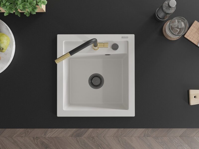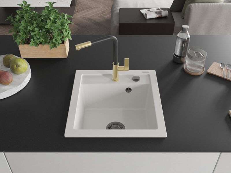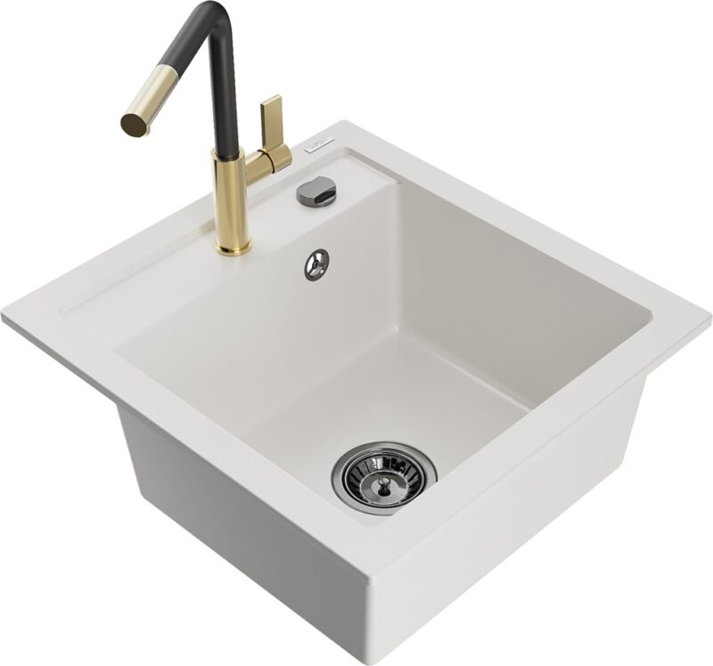 Technické dáta: drez: Rozmer: 520 x 490 x 210 mm Hĺbka komory: 200 mm Rozmery komory: 410×360 mm Priemer odtoku: ø90 mm Typ: 1-komorový Typ: Zapustené do pracovnej dosky biela farba Povrchová úprava sifónu: čierna Materiál: žula (80% žulové kamenivo, 20% živice) Prepadový otvor: Áno Otvory: (batérie, automatické) 2 Vysoká odolnosť proti poškriabaniu a zmene farby Odolnosť proti tepelným šokom Ľahko čistiteľný povrch Jeden dodatočný vyfrézovaný otvor na samodierovanie ø35 kuchynská batéria: Materiál: mosadz Farba: Zlatá/Čierna Hlava: Keramická Prevzdušňovač: Áno Typ: Jedna páka Rozsah výtoku: 245 mm Výška batérie: 307 mm(GT) Ean: 5905315057013
