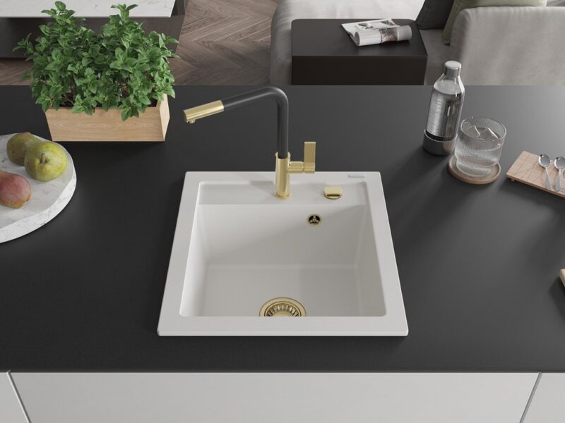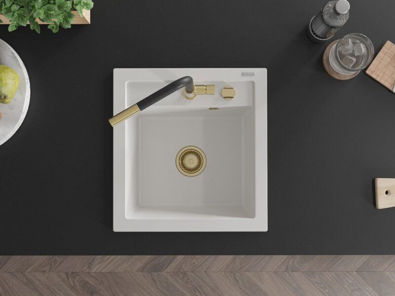 Technické dáta: drez: Rozmer: 520 x 490 x 210 mm Hĺbka komory: 200 mm Rozmery komory: 410×360 mm Priemer odtoku: ø90 mm Typ: 1-komorový Typ: Zapustené do pracovnej dosky biela farba Povrchová úprava sifónu: zlatá Materiál: žula (80% žulové kamenivo, 20% živice) Prepadový otvor: Áno Otvory: (batérie, automatické) 2 Vysoká odolnosť proti poškriabaniu a zmene farby Odolnosť proti tepelným šokom Ľahko čistiteľný povrch Jeden dodatočný vyfrézovaný otvor na samodierovanie ø35 kuchynská batéria: Materiál: mosadz Farba: Zlatá/Čierna Hlava: Keramická Prevzdušňovač: Áno Typ: Jedna páka Rozsah výtoku: 245 mm Výška batérie: 307 mm(GT) Ean: 5905315057006