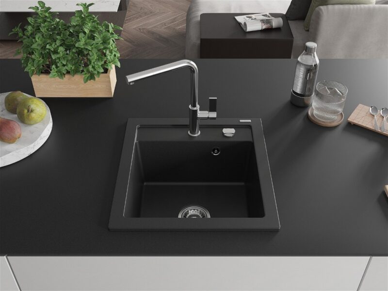 Technické dáta: drez: Rozmer: 520 x 490 x 210 mm Hĺbka komory: 200 mm Rozmery komory: 410×360 mm Priemer odtoku: ø90 mm Typ: 1-komorový Typ: Zapustené do pracovnej dosky Čierna farba Povrchová úprava sifónu: Chrome Materiál: žula (80% žulové kamenivo, 20% živice) Prepadový otvor: Áno Otvory: (batérie, automatické) 2 Vysoká odolnosť proti poškriabaniu a zmene farby Odolnosť proti tepelným šokom Ľahko čistiteľný povrch Jeden dodatočný vyfrézovaný otvor na samodierovanie ø35 kuchynská batéria: Materiál: mosadz Farba: Chrome Hlava: Keramická Prevzdušňovač: Áno Typ: Jedna páka Rozsah výtoku: 245 mm Výška batérie: 307 mm(GT) Ean: 5905315057396