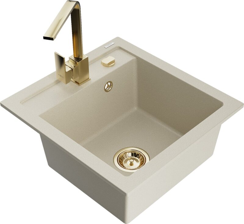 Technické dáta: drez: Rozmer: 520 x 490 x 210 mm Hĺbka komory: 200 mm Rozmery komory: 410×360 mm Priemer odtoku: ø90 mm Typ: 1-komorový Typ: Zapustené do pracovnej dosky Farba béžová Povrchová úprava sifónu: zlatá Materiál: žula (80% žulové kamenivo, 20% živice) Prepadový otvor: Áno Otvory: (batérie, automatické) 2 Vysoká odolnosť proti poškriabaniu a zmene farby Odolnosť proti tepelným šokom Ľahko čistiteľný povrch Jeden dodatočný vyfrézovaný otvor na samodierovanie ø35 kuchynská batéria: Materiál: mosadz Farba: Zlatá Hlava: Keramická Prevzdušňovač: Áno Typ: Jedna páka Výška batérie: 290 mm Rozsah výtoku: 220 mm(GT) Ean: 5905315017598
