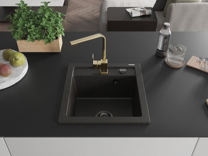 Technické dáta: drez: Rozmer: 520 x 490 x 210 mm Hĺbka komory: 200 mm Rozmery komory: 410×360 mm Priemer odtoku: ø90 mm Typ: 1-komorový Typ: Zapustené do pracovnej dosky Farba: čierna / zlatá metalíza Povrchová úprava sifónu: čierna Materiál: žula (80% žulové kamenivo, 20% živice) Prepadový otvor: Áno Otvory: (batérie, automatické) 2 Vysoká odolnosť proti poškriabaniu a zmene farby Odolnosť proti tepelným šokom Ľahko čistiteľný povrch Jeden dodatočný vyfrézovaný otvor na samodierovanie ø35 kuchynská batéria: Materiál: mosadz Farba: Zlatá Hlava: Keramická Prevzdušňovač: Áno Typ: Jedna páka Výška batérie: 290 mm Rozsah výtoku: 220 mm(GT) Ean: 5905315017727