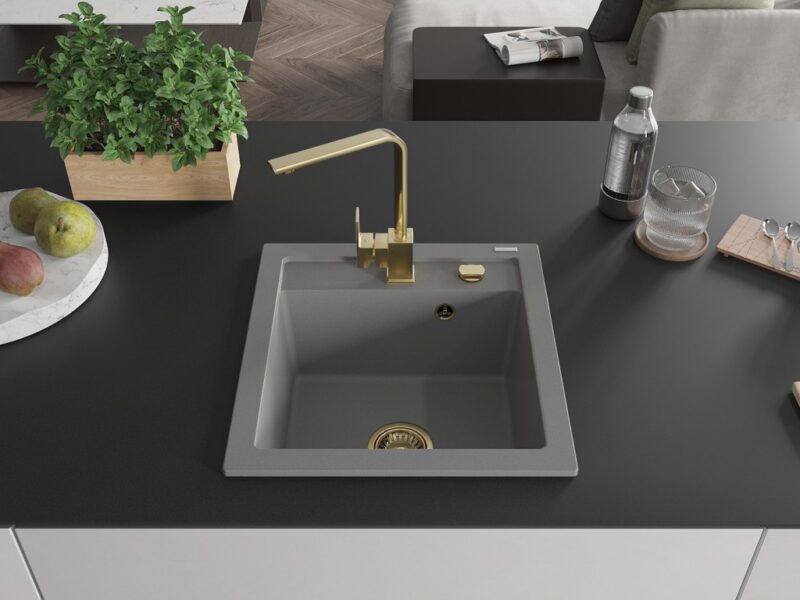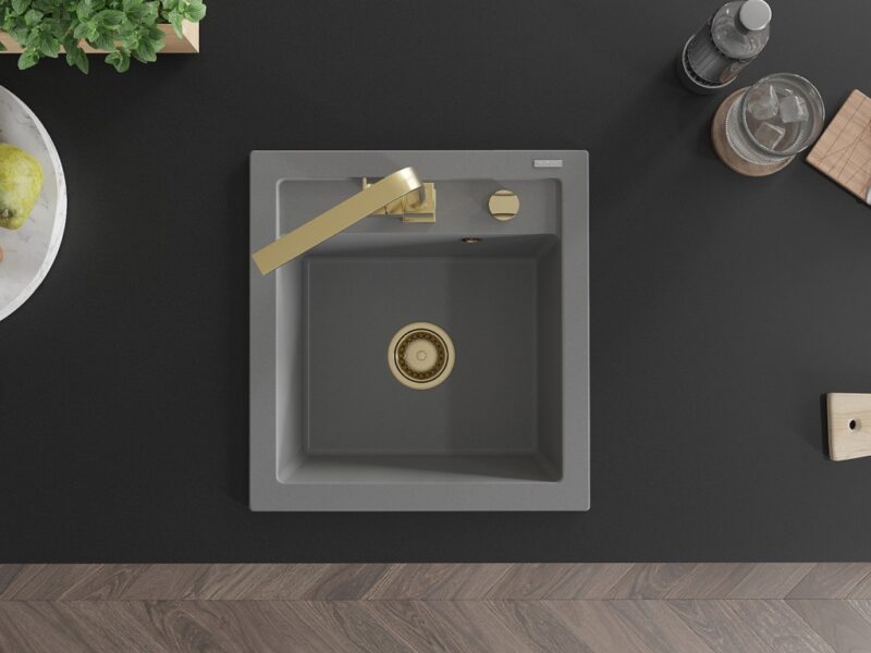 Technické dáta: drez: Rozmer: 520 x 490 x 210 mm Hĺbka komory: 200 mm Rozmery komory: 410×360 mm Priemer odtoku: ø90 mm Typ: 1-komorový Typ: Zapustené do pracovnej dosky Šedá farba Povrchová úprava sifónu: zlatá Materiál: žula (80% žulové kamenivo, 20% živice) Prepadový otvor: Áno Otvory: (batérie, automatické) 2 Vysoká odolnosť proti poškriabaniu a zmene farby Odolnosť proti tepelným šokom Ľahko čistiteľný povrch Jeden dodatočný vyfrézovaný otvor na samodierovanie ø35 kuchynská batéria: Materiál: mosadz Farba: Zlatá Hlava: Keramická Prevzdušňovač: Áno Typ: Jedna páka Výška batérie: 290 mm Rozsah výtoku: 220 mm(GT) Ean: 5905315017635