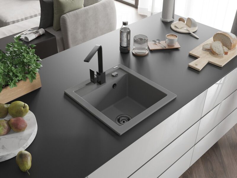 Technické dáta: drez: Rozmer: 520 x 490 x 210 mm Hĺbka komory: 200 mm Rozmery komory: 410×360 mm Priemer odtoku: ø90 mm Typ: 1-komorový Typ: Zapustené do pracovnej dosky Šedá farba Povrchová úprava sifónu: čierna Materiál: žula (80% žulové kamenivo, 20% živice) Prepadový otvor: Áno Otvory: (batérie, automatické) 2 Vysoká odolnosť proti poškriabaniu a zmene farby Odolnosť proti tepelným šokom Ľahko čistiteľný povrch Jeden dodatočný vyfrézovaný otvor na samodierovanie ø35 kuchynská batéria: Materiál: mosadz Čierna farba Hlava: Keramická Prevzdušňovač: Áno Typ: Jedna páka Výška batérie: 290 mm Rozsah výtoku: 220 mm(GT) Ean: 5905315017659
