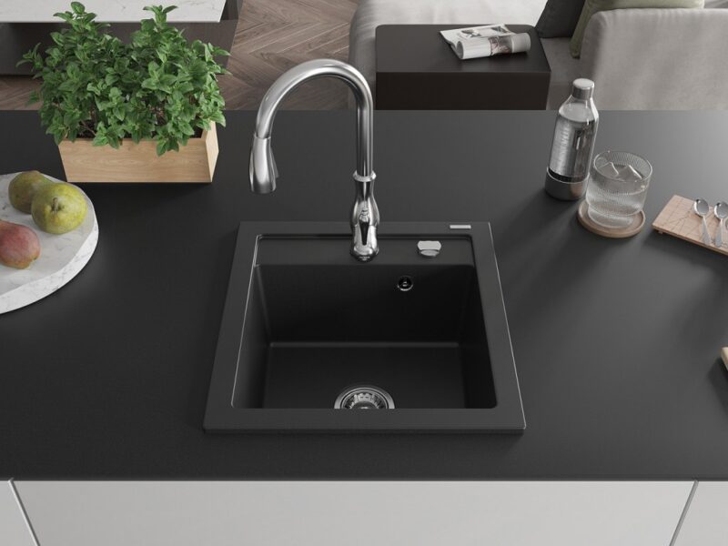 drez: Rozmer: 520 x 490 x 210 mm Hĺbka komory: 200 mm Rozmery komory: 410×360 mm Priemer odtoku: ø90 mm Typ: 1-komorový Typ: Zapustené do pracovnej dosky Čierna farba Povrchová úprava sifónu: Chrome Materiál: žula (80% žulové kamenivo, 20% živice) Prepadový otvor: Áno Otvory: (batérie, automatické) 2 Vysoká odolnosť proti poškriabaniu a zmene farby Odolnosť proti tepelným šokom Ľahko čistiteľný povrch Jeden dodatočný vyfrézovaný otvor na samodierovanie ø35 kuchynská batéria: Materiál: mosadz Farba: Chrome Hlava: Keramická Prevzdušňovač: Áno Typ: Jedna páka Výška batérie: 410 mm Rozsah výtoku: 231 mm(GT) Ean: 5905315033161