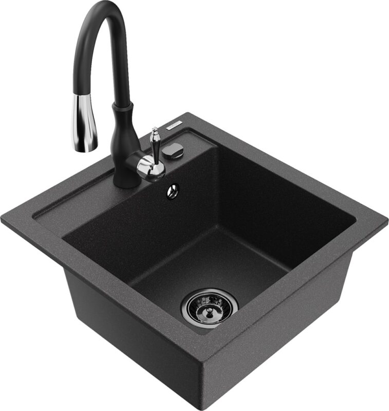 drez: Rozmer: 520 x 490 x 210 mm Hĺbka komory: 200 mm Rozmery komory: 410×360 mm Priemer odtoku: ø90 mm Typ: 1-komorový Typ: Zapustené do pracovnej dosky Farba: Škvrnitá čierna Povrchová úprava sifónu: čierna Materiál: žula (80% žulové kamenivo, 20% živice) Prepadový otvor: Áno Otvory: (batérie, automatické) 2 Vysoká odolnosť proti poškriabaniu a zmene farby Odolnosť proti tepelným šokom Ľahko čistiteľný povrch Jeden dodatočný vyfrézovaný otvor na samodierovanie ø35 kuchynská batéria: Materiál: mosadz Čierna farba Hlava: Keramická Prevzdušňovač: Áno Typ: Jedna páka Výška batérie: 410 mm Rozsah výtoku: 231 mm(GT) Ean: 5905315033147