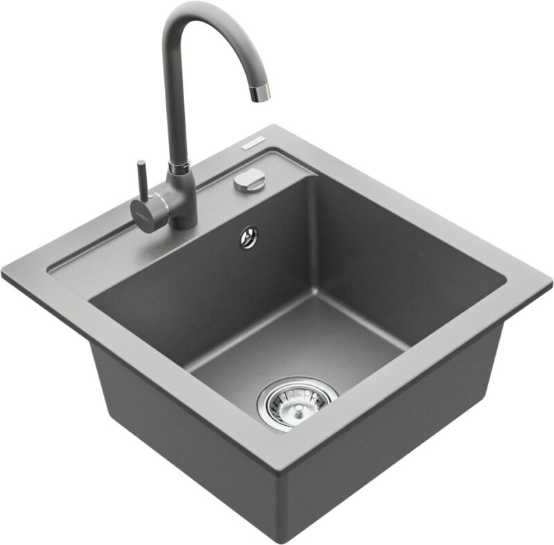 Technické dáta: drez: Rozmer: 520 x 490 x 210 mm Hĺbka komory: 200 mm Rozmery komory: 410×360 mm Priemer odtoku: ø90 mm Typ: 1-komorový Typ: Zapustené do pracovnej dosky Šedá farba Povrchová úprava sifónu: Chrome Materiál: žula (80% žulové kamenivo, 20% živice) Prepadový otvor: Áno Otvory: (batérie, automatické) 2 Vysoká odolnosť proti poškriabaniu a zmene farby Odolnosť proti tepelným šokom Ľahko čistiteľný povrch Jeden dodatočný vyfrézovaný otvor na samodierovanie ø35 kuchynská batéria: Materiál: mosadz Šedá farba Hlava: Keramická Prevzdušňovač: Áno Výška batérie: 335 mm Rozsah výtoku: 180 mm(GT) Ean: 5907709189300