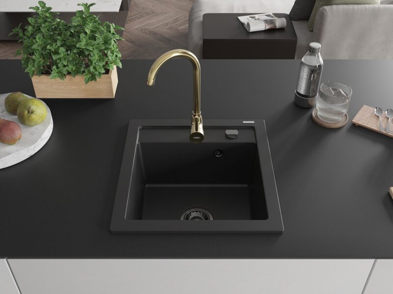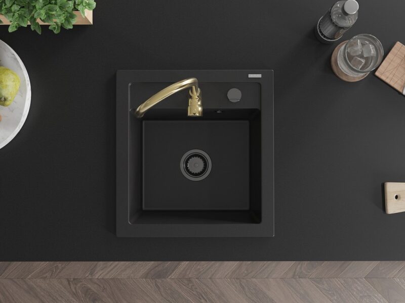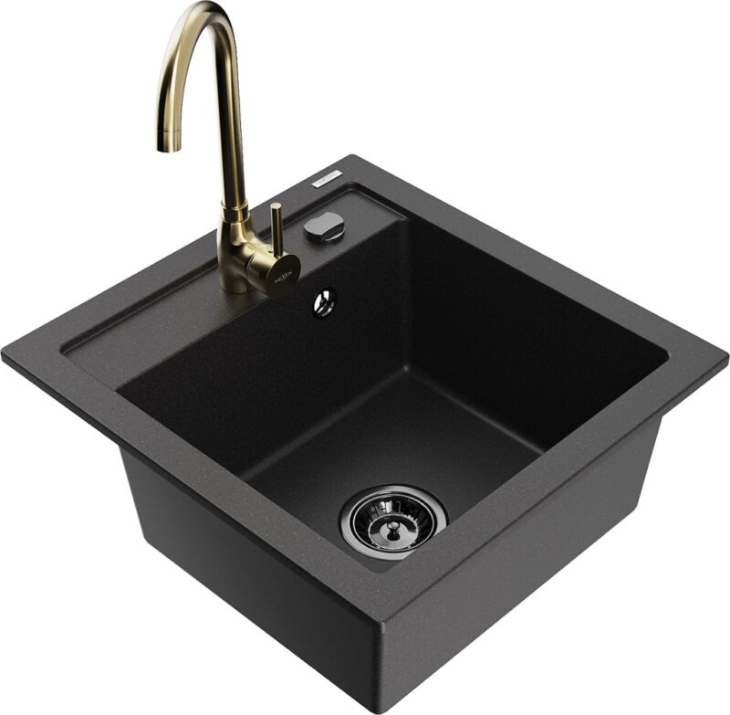 Technické dáta: drez: Rozmer: 520 x 490 x 210 mm Hĺbka komory: 200 mm Rozmery komory: 410×360 mm Priemer odtoku: ø90 mm Typ: 1-komorový Typ: Zapustené do pracovnej dosky Čierna farba Povrchová úprava sifónu: čierna Materiál: žula (80% žulové kamenivo, 20% živice) Prepadový otvor: Áno Otvory: (batérie, automatické) 2 Vysoká odolnosť proti poškriabaniu a zmene farby Odolnosť proti tepelným šokom Ľahko čistiteľný povrch Jeden dodatočný vyfrézovaný otvor na samodierovanie ø35 kuchynská batéria: Materiál: mosadz Farba: Zlatá Hlava: Keramická Prevzdušňovač: Áno Typ: Jedna páka Výška batérie: 335 mm Rozsah výtoku: 180 mm(GT) Ean: 5905315014214