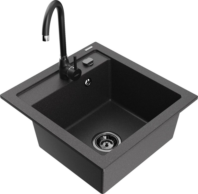 Technické dáta: drez: Rozmer: 520 x 490 x 210 mm Hĺbka komory: 200 mm Rozmery komory: 410×360 mm Priemer odtoku: ø90 mm Typ: 1-komorový Typ: Zapustené do pracovnej dosky Farba: Škvrnitá čierna Povrchová úprava sifónu: čierna Materiál: žula (80% žulové kamenivo, 20% živice) Prepadový otvor: Áno Otvory: (batérie, automatické) 2 Vysoká odolnosť proti poškriabaniu a zmene farby Odolnosť proti tepelným šokom Ľahko čistiteľný povrch Jeden dodatočný vyfrézovaný otvor na samodierovanie ø35 kuchynská batéria: Materiál: mosadz Čierna farba Hlava: Keramická Prevzdušňovač: Áno Typ: Jedna páka Výška batérie: 335 mm Rozsah výtoku: 180 mm(GT) Ean: 5905315014207