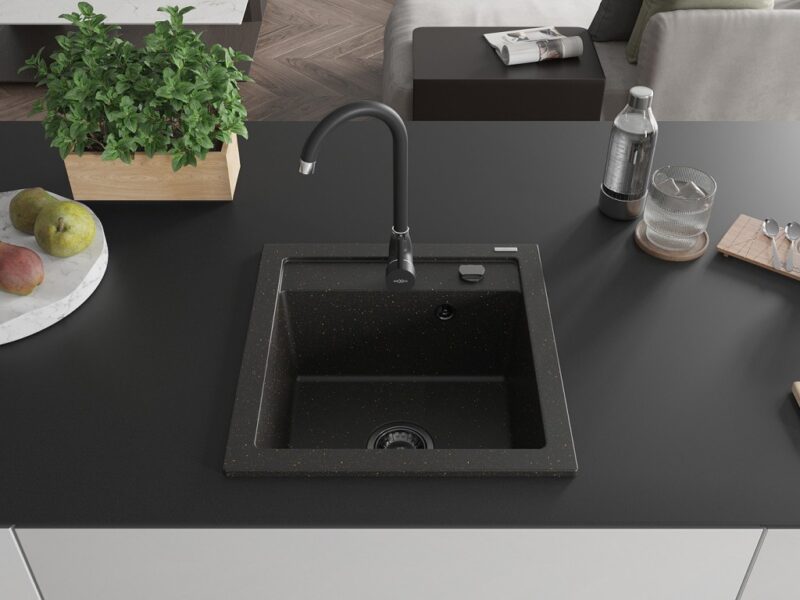 Technické dáta: drez: Rozmer: 520 x 490 x 210 mm Hĺbka komory: 200 mm Rozmery komory: 410×360 mm Priemer odtoku: ø90 mm Typ: 1-komorový Typ: Zapustené do pracovnej dosky Farba: čierna / zlatá metalíza Povrchová úprava sifónu: čierna Materiál: žula (80% žulové kamenivo, 20% živice) Prepadový otvor: Áno Otvory: (batérie, automatické) 2 Vysoká odolnosť proti poškriabaniu a zmene farby Odolnosť proti tepelným šokom Ľahko čistiteľný povrch Jeden dodatočný vyfrézovaný otvor na samodierovanie ø35 kuchynská batéria: Materiál: mosadz Čierna farba Hlava: Keramická Prevzdušňovač: Áno Typ: Jedna páka Výška batérie: 335 mm Rozsah výtoku: 180 mm(GT) Ean: 5905315014177