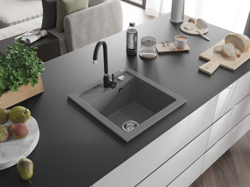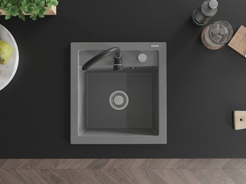 Technické dáta: drez: Rozmer: 520 x 490 x 210 mm Hĺbka komory: 200 mm Rozmery komory: 410×360 mm Priemer odtoku: ø90 mm Typ: 1-komorový Typ: Zapustené do pracovnej dosky Šedá farba Povrchová úprava sifónu: Chrome Materiál: žula (80% žulové kamenivo, 20% živice) Prepadový otvor: Áno Otvory: (batérie, automatické) 2 Vysoká odolnosť proti poškriabaniu a zmene farby Odolnosť proti tepelným šokom Ľahko čistiteľný povrch Jeden dodatočný vyfrézovaný otvor na samodierovanie ø35 kuchynská batéria: Materiál: mosadz Čierna farba Hlava: Keramická Prevzdušňovač: Áno Typ: Jedna páka Výška batérie: 335 mm Rozsah výtoku: 180 mm(GT) Ean: 5905315014115