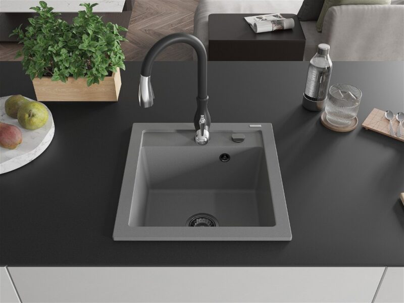 Drez: Rozmer: 520x490x210 mm Hĺbka komory: 200 mm Rozmery komory: 410×360 mm Priemer odtoku: ø90 mm Typ: 1-komorový Typ: Zapustené do pracovnej dosky Šedá farba Povrchová úprava sifónu: čierna Materiál: žula (80% žulové kamenivo 20% živice) Prepadový otvor: Áno Otvory: (batérie, automat) 2 Vysoká odolnosť proti poškriabaniu a zmene farby Odolnosť proti tepelným šokom Povrch pre ľahké čistenie Jeden dodatočný vyfrézovaný otvor na samodierovanie ø35 Kuchynská batéria: Materiál: mosadz Čierna farba Hlava: Keramická Perlátor: Áno Typ: Jednopákové Výška batérie: 410 mm Rozsah výtoku: 231 mm(GT) Ean: 5905315033024