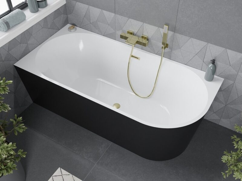 Špecifikácia produktu: Rozmer: 150 x 75 cm Výška: 58 cm Hĺbka: 45 cm Inštalácia: Rohová, Ľavá Materiál: Sanitárny akryl Farba: Biela/Čierna Povrchová úprava: brúsené zlato Prepadový otvor. Áno Otvor pre kohútik: Nie Sada obsahuje sifón a zátku click-clack Odolnosť proti matovaniu a UV žiareniu(GT) Ean: 5905315382443
