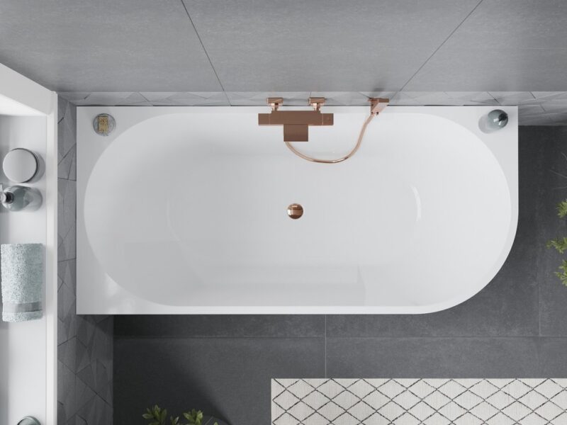 MEXEN/S – Mia voľne stojaca rohová vaňa ľavá 180 x 80, biela, sifón a prepad ružové zlato 52691808000L-60