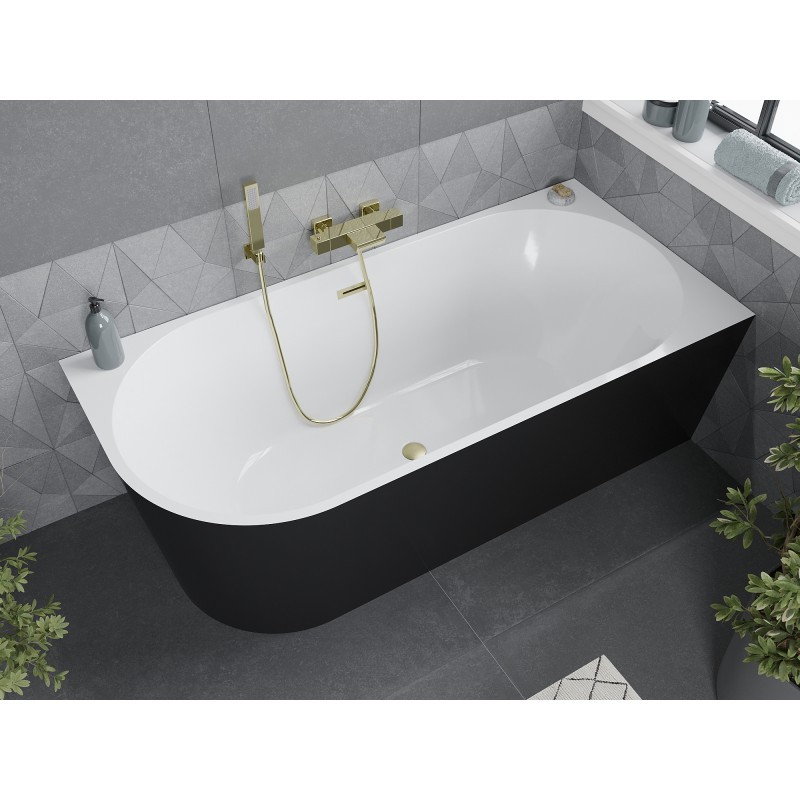 MEXEN/S – Mia voľne stojaca rohová vaňa pravá 160 x 80, biela/čierna, sifón a prepad zlatá kartáčovaná 52691608075P-55