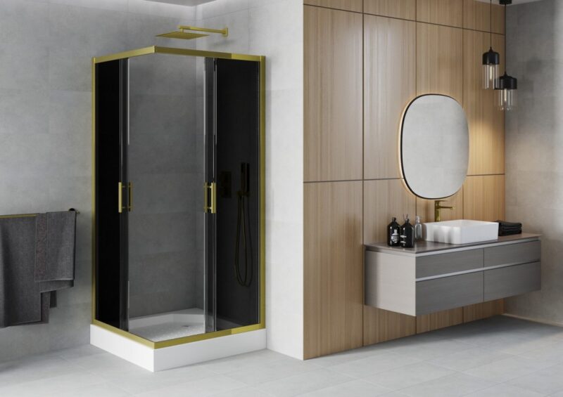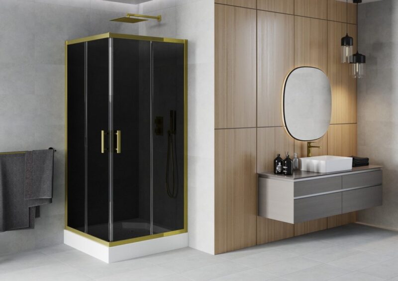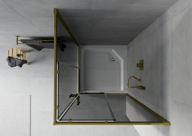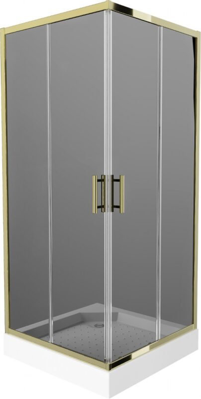 MEXEN/S – Rio sprchovací kút štvorec 90 x 90, grafit, zlato + vanička Rio vrátane výpuste 860-090-090-50-40-4510