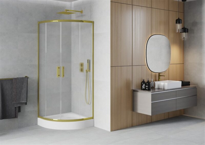 MEXEN/S – Rio sprchovací kút štvrťkruh 70 x 70, dekor, zlato + vanička Rio vrátane výpuste 863-070-070-50-30-4710