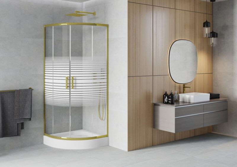 MEXEN/S – Rio sprchovací kút štvrťkruh 70 x 70, pruhy, zlato + vanička Rio vrátane výpuste 863-070-070-50-20-4710