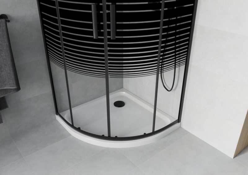 MEXEN/S – Rio sprchovací kút štvrťkruh 90×90, pruhy, čierna + biela vanička so sifónom 863-090-090-70-20-4110B