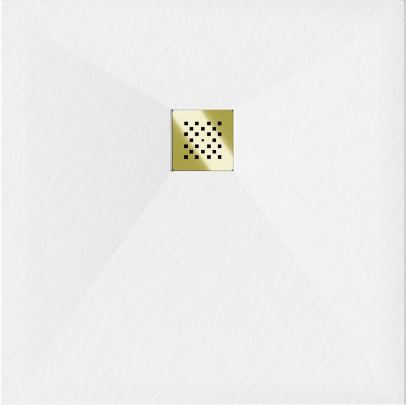 Technické dáta: Rozmer: 70 x 70 x 2,5 cm biela farba Typ: štvorcový, ultra plochý Inštalácia: Do podlahy alebo na podlahu Materiál: Minerálny kompozit Kamenná štruktúra Odolný produkt, ktorý sa nedeformuje Maximálna stabilita vďaka dobrej odolnosti proti nárazu Sada obsahuje sifón, ktorý sa čistí zhora Priemer odtoku: 90 mm Povrchová úprava mriežky: zlatá(GT) Ean: 5905315222633