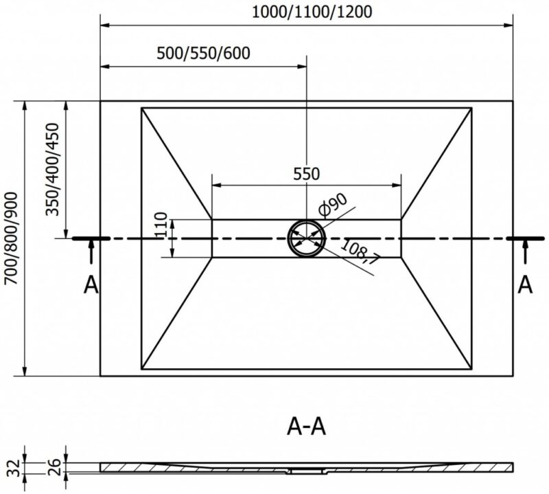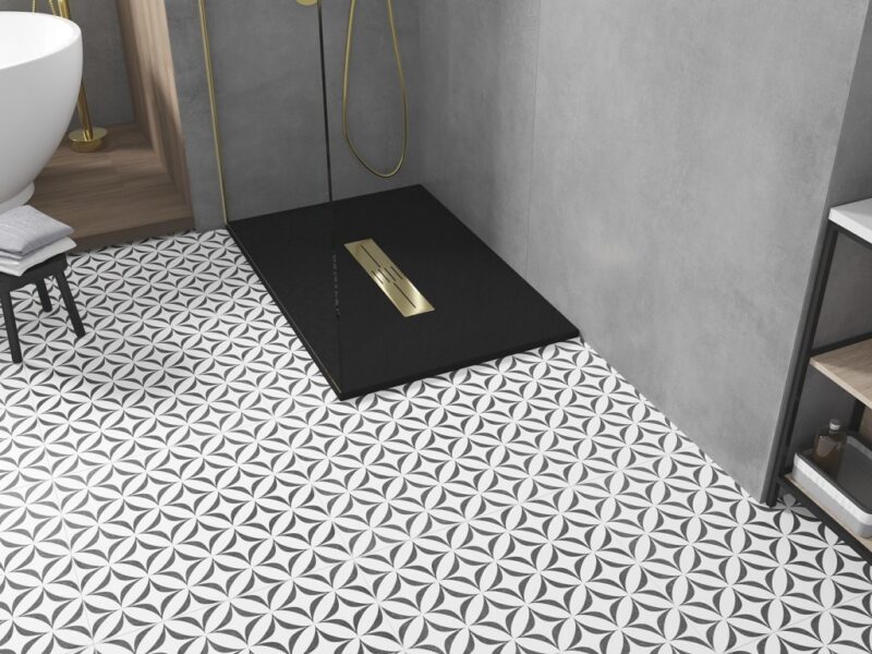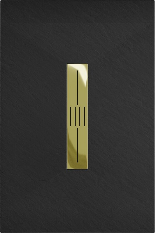 Technické dáta: Rozmer: 110x90x2, 6 cm Čierna farba Typ: Obdĺžnikový, Ultra plochý Inštalácia: Do podlahy alebo na podlahu Materiál: SMC – plast Kamenná štruktúra Možnosť rezania sprchovej vaničky Odolný produkt, ktorý sa nedeformuje Maximálna stabilita vďaka dobrej odolnosti proti nárazu Sada obsahuje sifón, ktorý sa čistí zhora Priemer odtoku: 90 mm Povrchová úprava mriežky: zlatá(GT) Ean: 5905315227959