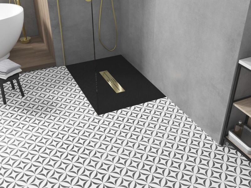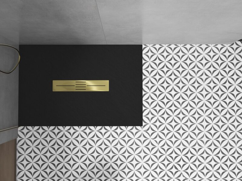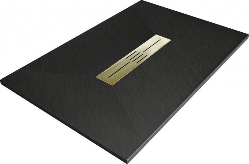 Technické dáta: Rozmer: 120x90x2, 6 cm Čierna farba Typ: Obdĺžnikový, Ultra plochý Inštalácia: Do podlahy alebo na podlahu Materiál: SMC – plast Kamenná štruktúra Možnosť rezania sprchovej vaničky Odolný výrobok, ktorý sa nedeformuje Maximálna stabilita vďaka dobrej odolnosti proti nárazu Sada obsahuje sifón, ktorý sa čistí zhora Priemer odtoku: 90 mm Povrchová úprava mriežky: zlatá(GT) Ean: 5905315227966