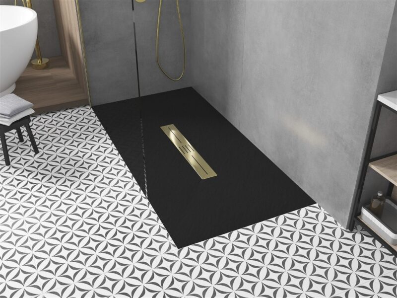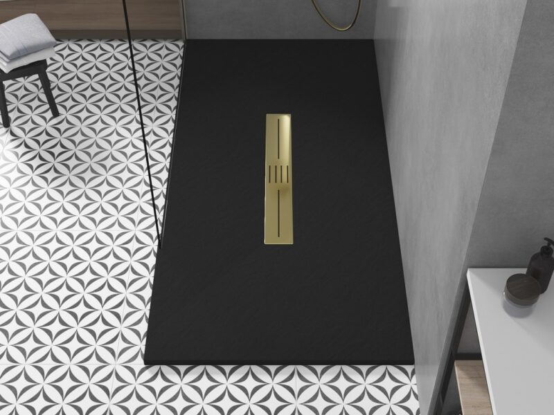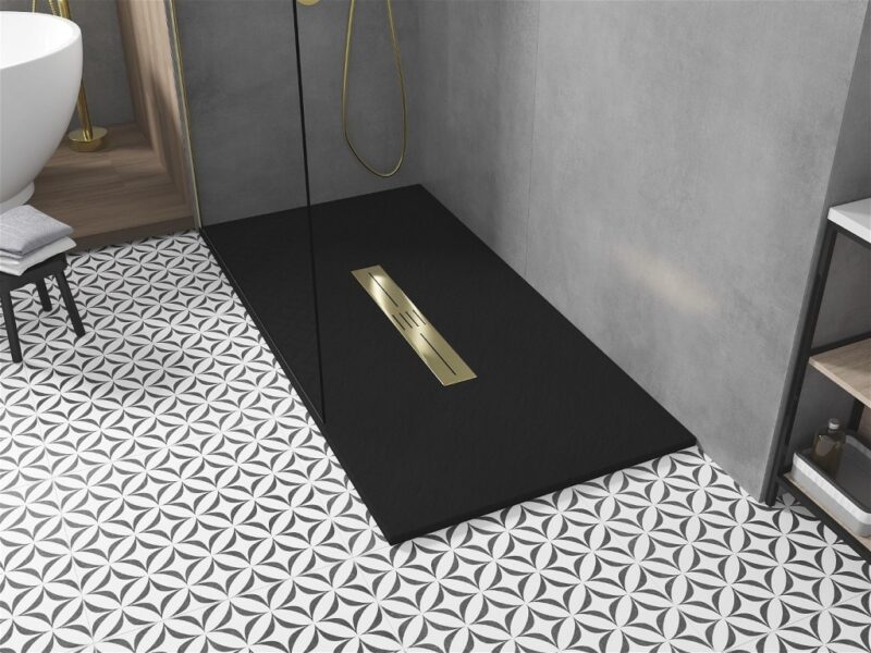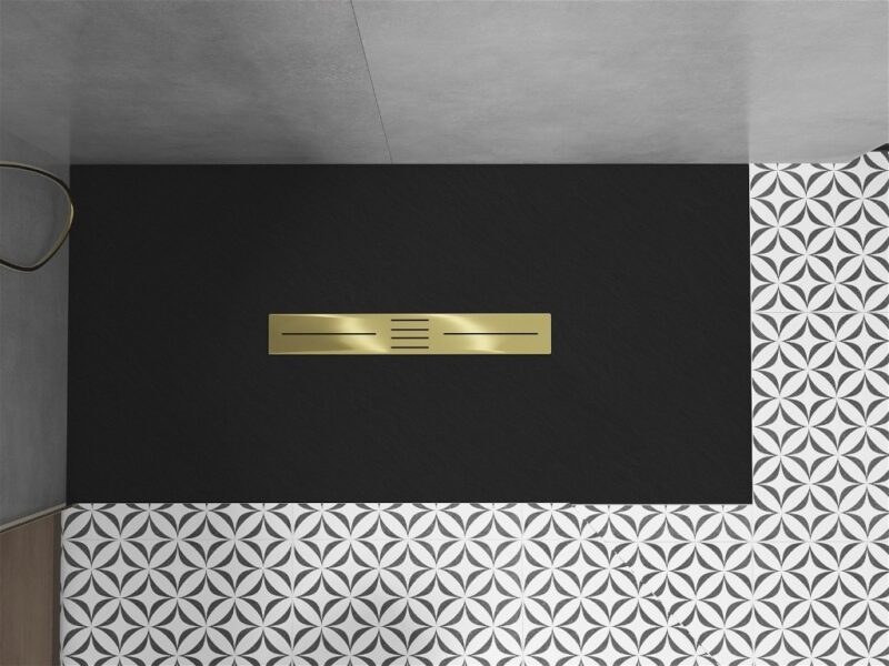 Technické dáta: Rozmer: 160x90x2, 6 cm Čierna farba Typ: Obdĺžnikový, Ultra plochý Inštalácia: Do podlahy alebo na podlahu Materiál: SMC – plast Kamenná štruktúra Možnosť rezania sprchovej vaničky Odolný produkt, ktorý sa nedeformuje Maximálna stabilita vďaka dobrej odolnosti proti nárazu Sada obsahuje sifón, ktorý sa čistí zhora Priemer odtoku: 90 mm Povrchová úprava mriežky: zlatá(GT) Ean: 5905315228000