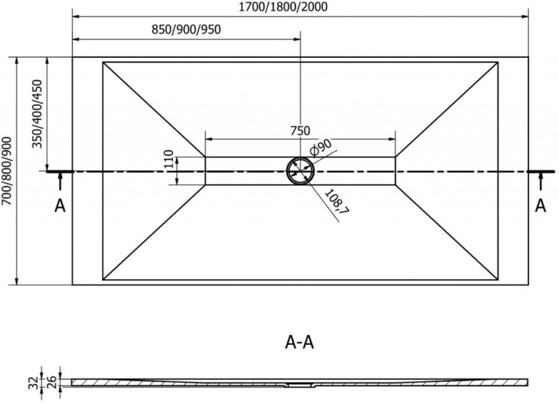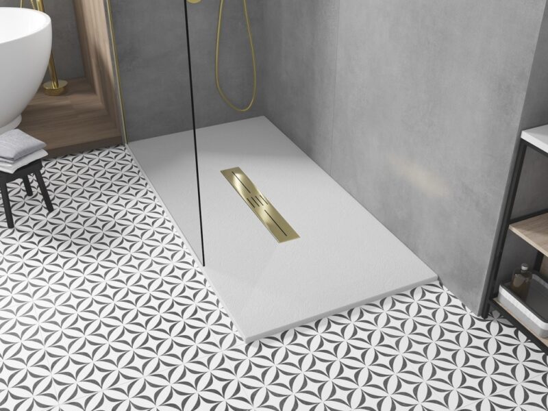 Technické dáta: Rozmer: 170x70x2, 6 cm biela farba Typ: Obdĺžnikový, Ultra plochý Inštalácia: Do podlahy alebo na podlahu Materiál: SMC – plast Kamenná štruktúra Možnosť rezania sprchovej vaničky Odolný produkt, ktorý sa nedeformuje Maximálna stabilita vďaka dobrej odolnosti proti nárazu Sada obsahuje sifón, ktorý sa čistí zhora Priemer odtoku: 90 mm Povrchová úprava mriežky: zlatá(GT) Ean: 5905315227218