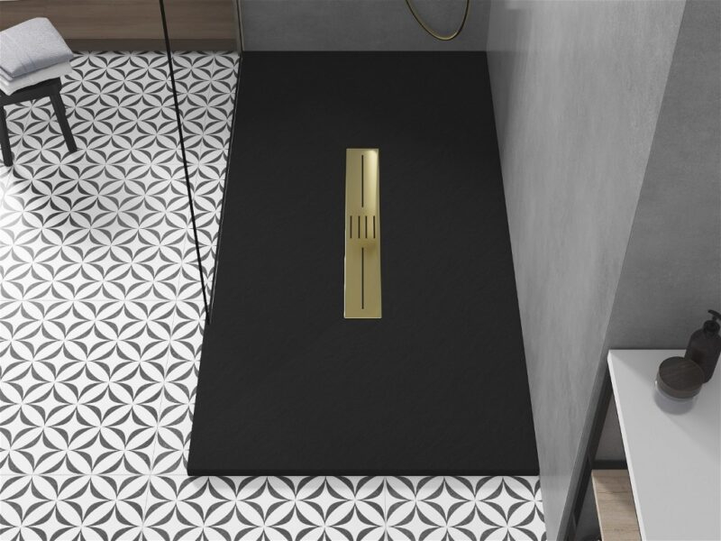 Technické dáta: Rozmer: 180x80x2, 6 cm Čierna farba Typ: Obdĺžnikový, Ultra plochý Inštalácia: Do podlahy alebo na podlahu Materiál: SMC – plast Kamenná štruktúra Možnosť rezania sprchovej vaničky Odolný výrobok, ktorý sa nedeformuje Maximálna stabilita vďaka dobrej odolnosti proti nárazu Sada obsahuje sifón, ktorý sa čistí zhora Priemer odtoku: 90 mm Povrchová úprava mriežky: zlatá(GT) Ean: 5905315227928