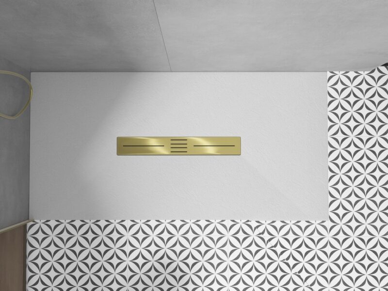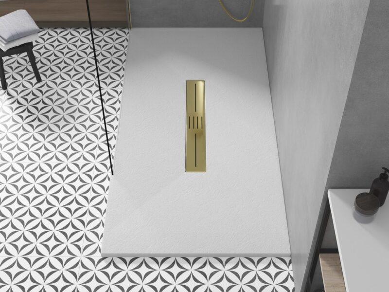 Technické dáta: Rozmer: 200x70x2, 6 cm biela farba Typ: Obdĺžnikový, Ultra plochý Inštalácia: Do podlahy alebo na podlahu Materiál: SMC – plast Kamenná štruktúra Možnosť rezania sprchovej vaničky Odolný produkt, ktorý sa nedeformuje Maximálna stabilita vďaka dobrej odolnosti proti nárazu Sada obsahuje sifón, ktorý sa čistí zhora Priemer odtoku: 90 mm Povrchová úprava mriežky: zlatá(GT) Ean: 5905315227232