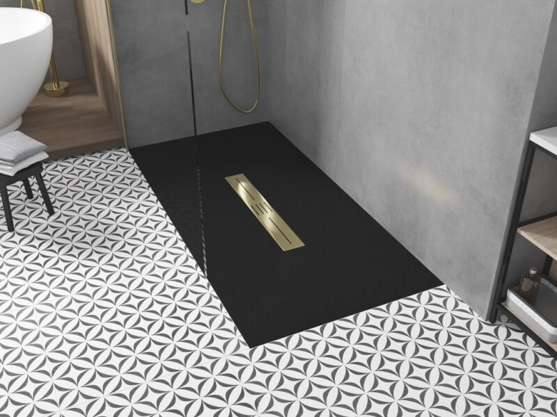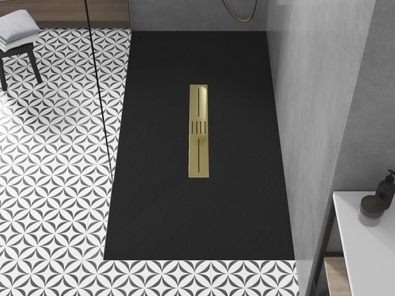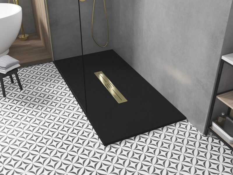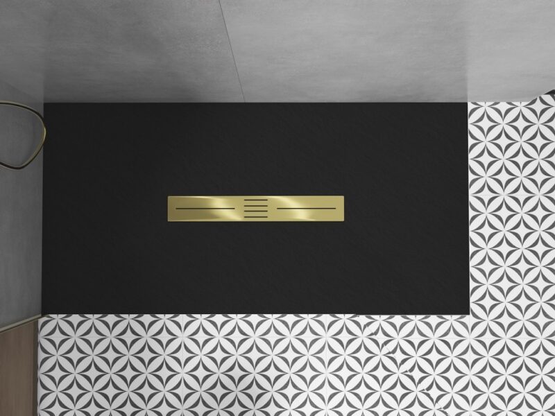 Technické dáta: Rozmer: 200x80x2, 6 cm Čierna farba Typ: Obdĺžnikový, Ultra plochý Inštalácia: Do podlahy alebo na podlahu Materiál: SMC – plast Kamenná štruktúra Možnosť rezania sprchovej vaničky Odolný výrobok, ktorý sa nedeformuje Maximálna stabilita vďaka dobrej odolnosti proti nárazu Sada obsahuje sifón, ktorý sa čistí zhora Priemer odtoku: 90 mm Povrchová úprava mriežky: zlatá(GT) Ean: 5905315227935