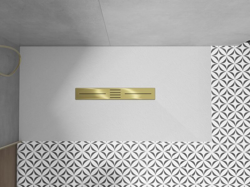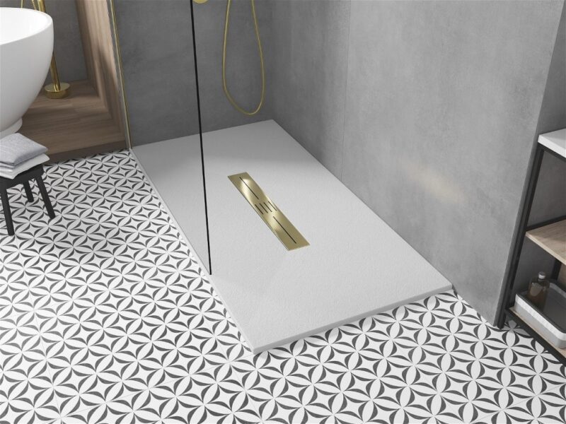 Technické dáta: Rozmer: 200x90x2, 6 cm biela farba Typ: Obdĺžnikový, Ultra plochý Inštalácia: Do podlahy alebo na podlahu Materiál: SMC – plast Kamenná štruktúra Možnosť rezania sprchovej vaničky Odolný výrobok, ktorý sa nedeformuje Maximálna stabilita vďaka dobrej odolnosti proti nárazu Sada obsahuje sifón, ktorý sa čistí zhora Priemer odtoku: 90 mm Povrchová úprava mriežky: zlatá(GT) Ean: 5905315227430