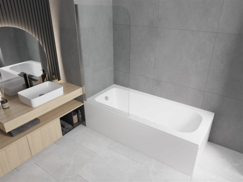 MEXEN/S – Vega obdĺžniková vaňa 150 x 70 cm s panelom + vaňová zástena 70, transparent, chróm 550115070X9007010100