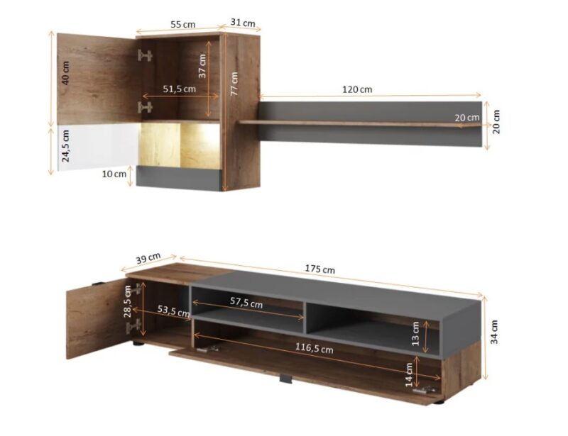 Malá zostava nábytku MIKIMI je ideálnym prvkom do modernej obývačky.Svoje uplatnenie nájde tak v malých obývačkách ale aj vo veľkých priestoroch, kde ponechá vzdušnosť a priestrannosť. Vďaka štýlovému farebnému prevedeniu sa stane unikátnou ozdobou Vašej domácnosti. Spodnú časť zostavy tvorí TV stolík, na ktorom nájde svoje miesto TV prijímač a ďalšia potrebná technika. Jeho súčasťou sú aj 2 uzatvorené priestory. Rozmery (š/v/h): 175 x 35 x 39 cm.Horná časť sa skladá z efektnej vitrínovej skrinky a závesnej poličky v dvojfarebnom prevedení. Tieto poskytnú priestor pre umiestnenie dekoračných predmetov či fotografii. Súčasťou vitríny nie je osvetlenie. Rozmery vitríny (š/v/h): 55 x 78,5 x 31 cm. Rozmery poličky (š/v/h): 120 x 20 x 20 cm.Nábytok je vyrobený z kvalitnej LTD dosky, ktorá nie je náročná na údržbu. Farebné prevedenie je v kombinácii stále žiadanej farby dub sonoma a moderného antracitu. Farebný odtieň na fotke môže mať malé odchylky od reálnej farby materiálu.Obývacia stena je dostupná len ako zostava.Celkové rozmery (š/v/h): 175 x 220 x 39 cm.Dodávame v demonte.