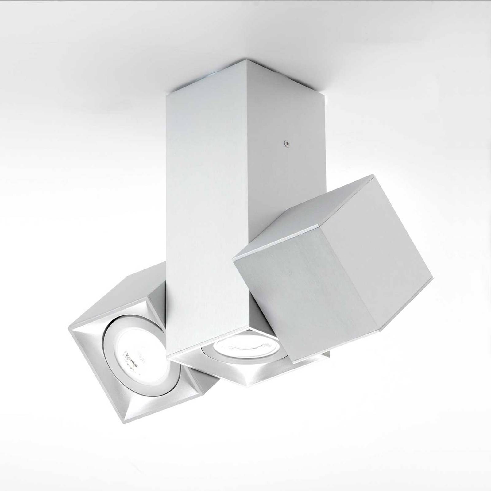 Pohyblivé stropné svietidlo Dau s tromi hliníkovými bodmi Stropné svietidlo Dau Spot sa skladá z troch prvkov. Pevný podlhovastý reflektor v strede a dva reflektory v tvare kocky na ľavej a pravej strane. Svietidlo sa dá otáčať o 300°. Vonkajšie prvky sa dajú tiež otáčať o 300°. To umožňuje nasmerovať svetlo podľa potreby a zvýrazniť určité oblasti. Flexibilita, ktorú svietidlo Dau ponúka, sa využíva nielen v súkromných obytných priestoroch, ale s výhodou aj v komerčnom sektore – vrátane adaptérového krúžku pre 50 mm svietidlá